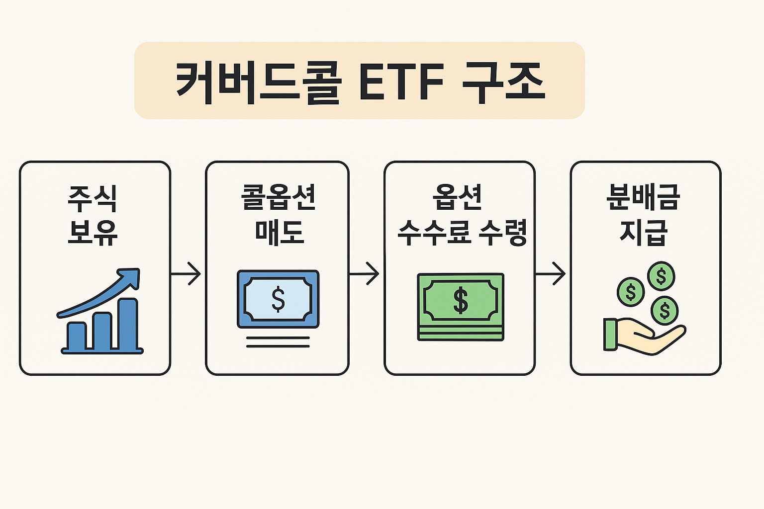 - 국내: TIGER S&P500 커버드콜, KODEX 나스닥100 커버드콜, RISE 200 위클리커버드콜 등